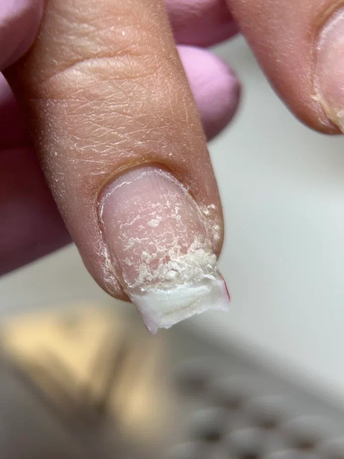 • Механический онихолизис или травмы. Особенности работы с такими ногтями выбор материала